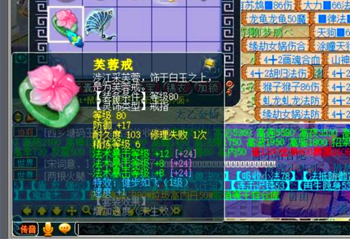 上面这位玩家的角色上带着一件80级拥有着三条法术暴击等级的戒指。上面的这种戒指是在灵饰系统刚刚上线的时候有系统赠送的。当时有一部分运气比较好的玩家获得了这样的装备,上面这位玩家想知道将这样的装备放到角色上一起出售,能够给角色加多少钱。像上面的这种绑定的灵饰在藏宝阁上是不显示的,因为不能交易的原因,所以其价值正常的情况下是可交易装备的一半,但因为不显示的原因卖起来比较麻烦。需要让别人上号查验。