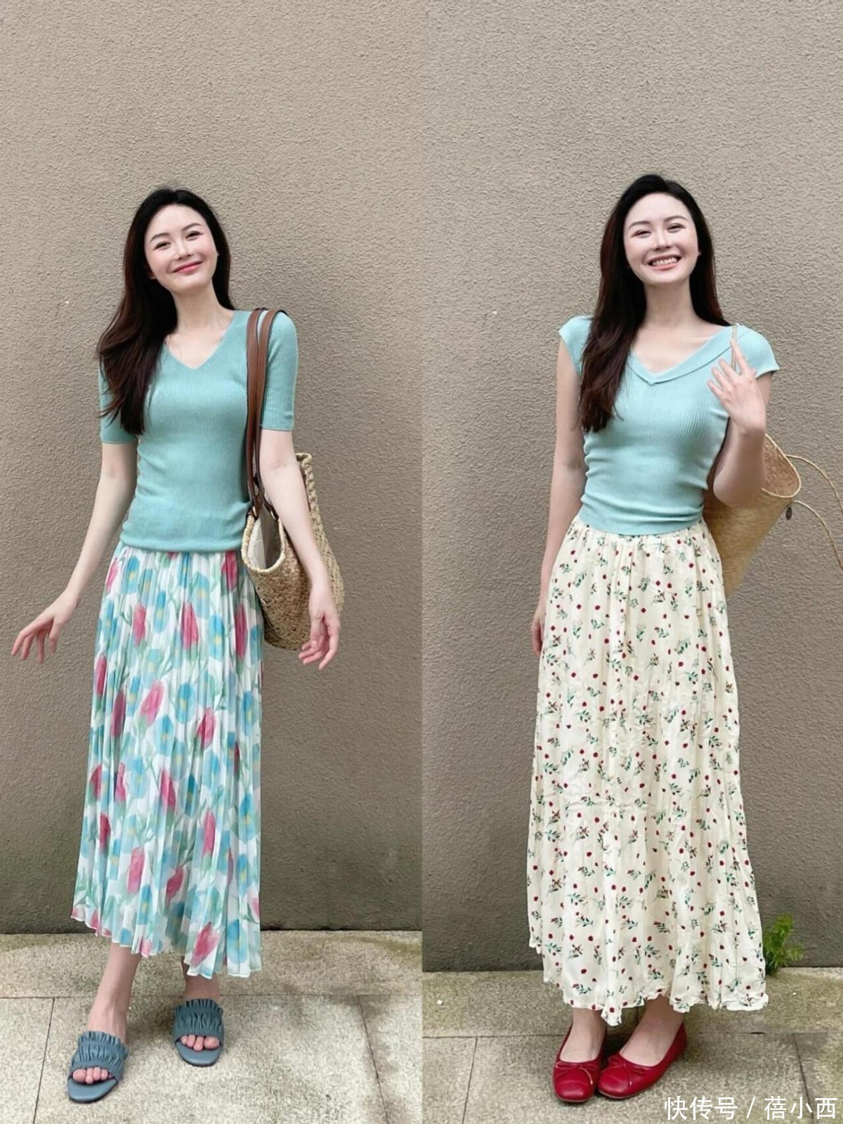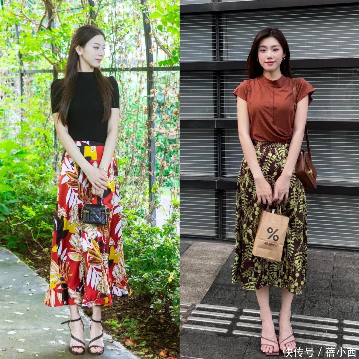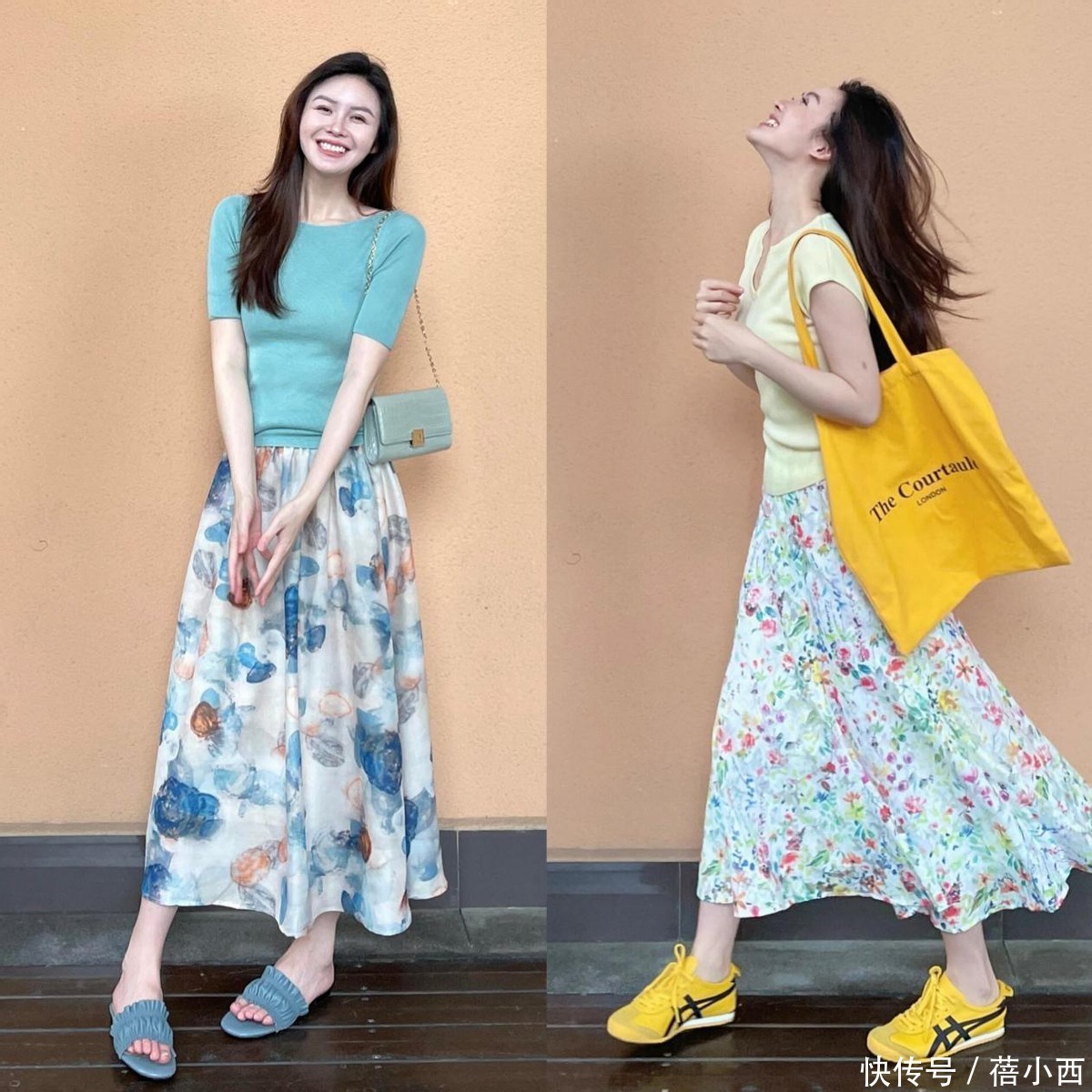 成熟女性可以用修身的纯色打底衫搭配碎花半身裙,形成简繁结合的效果,平衡你的整个搭配,看起来不油腻,也不花哨,会更加利落时髦。