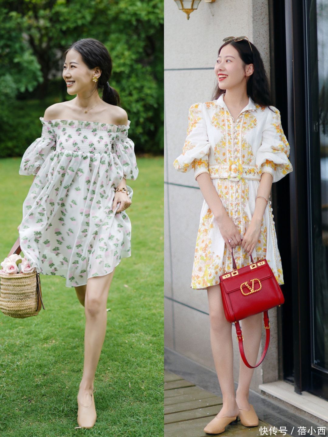 约会时的印花连衣裙搭配,要突出女性的柔美与浪漫,推荐姐妹们挑选带有蕾丝、荷叶边和泡泡袖等设计元素,且印花较为精致细腻的连衣裙,结合粉色、鹅黄色等柔和色调更能衬托温柔气质,谁穿谁显白。